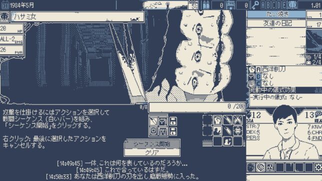難点としてはUIがとにかく画面に情報が溢れているところ。確認しなければならないステータスも多く、結構慣れるまで大変で、知りたい情報や行動までの手間も多い。ただデザインがこのようになっているのには明確な意図があるように思う。ゲーム起動時の古いパソコンの起動音のようなSEに始まり、画面外にCRTモニタを思わせる枠、1Bit(2Bitにもできる)のドットグラフィックやレトロ音源のサウンドなど含め、本作は初代~2代目マッキントッシュの「HyperCard」で作られたようなゲームに徹底的に寄せて作られていると感じた。HyperCardは簡単なプログラミングができるソフトウェアで私も子供の頃に触ったことがあるのだが、その視点で見ると本作はそのままHyperCard風ゲームで作れそうな挙動で構成されており、グラフィックも含めて完成度は相当に高いと思う。